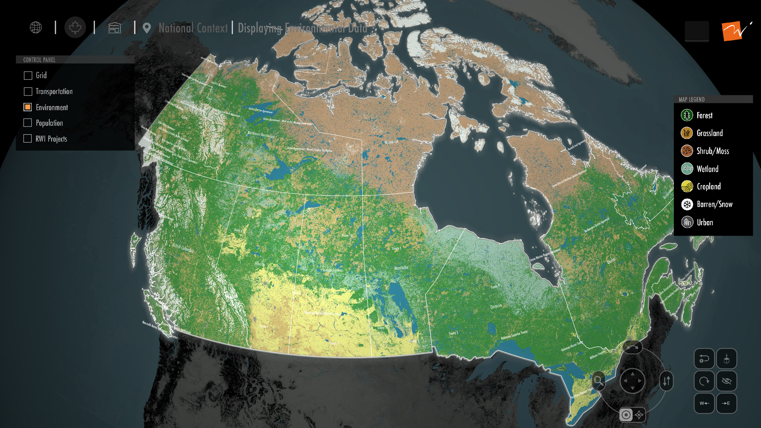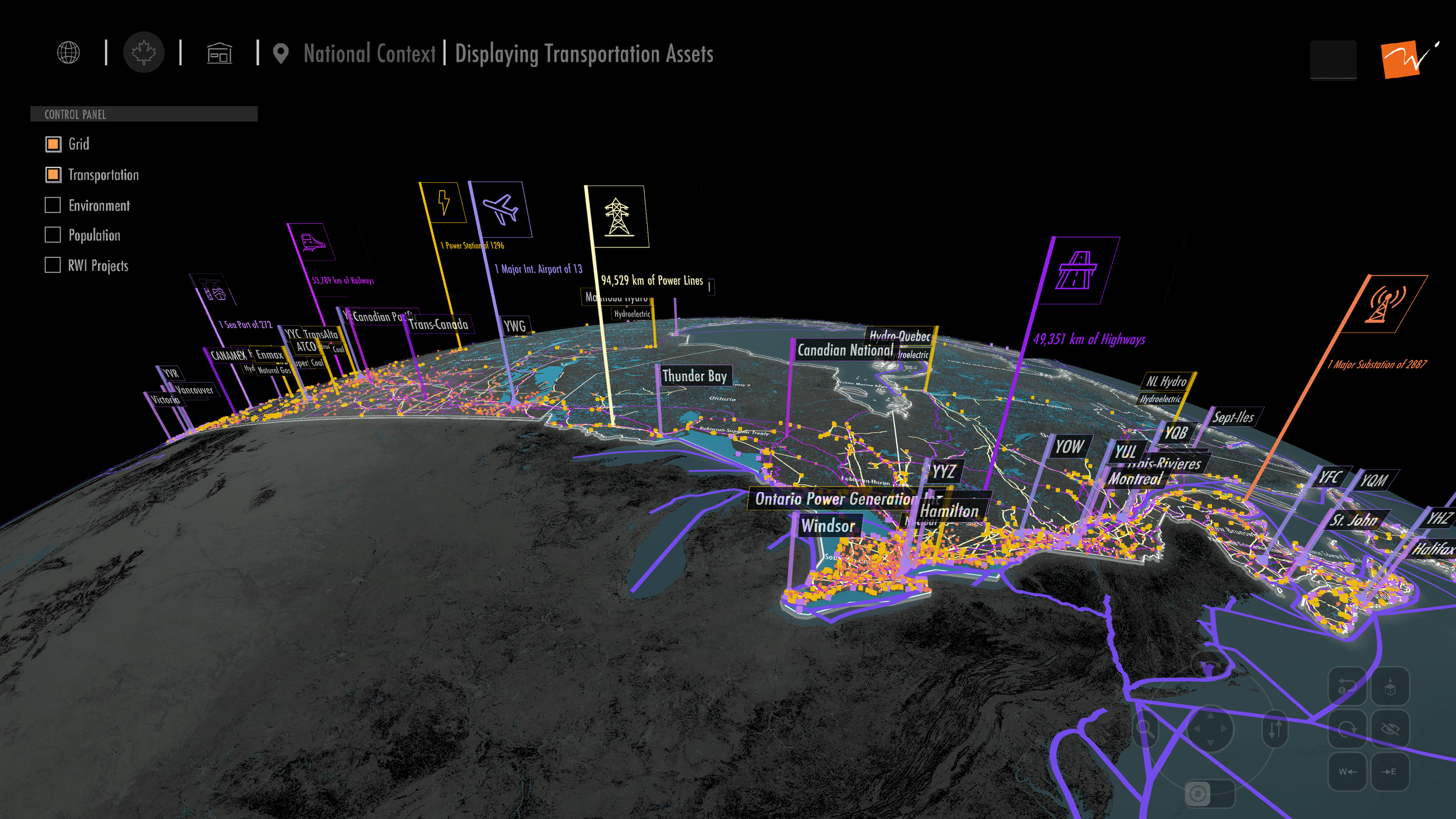 In Synthetic Canada, users overlay and explore the intersection of all of the elements of the built environment, including transportation, grid infrastructure, and natural environment, in real-time, from global to national to regional contexts, all through an intuitive interface.