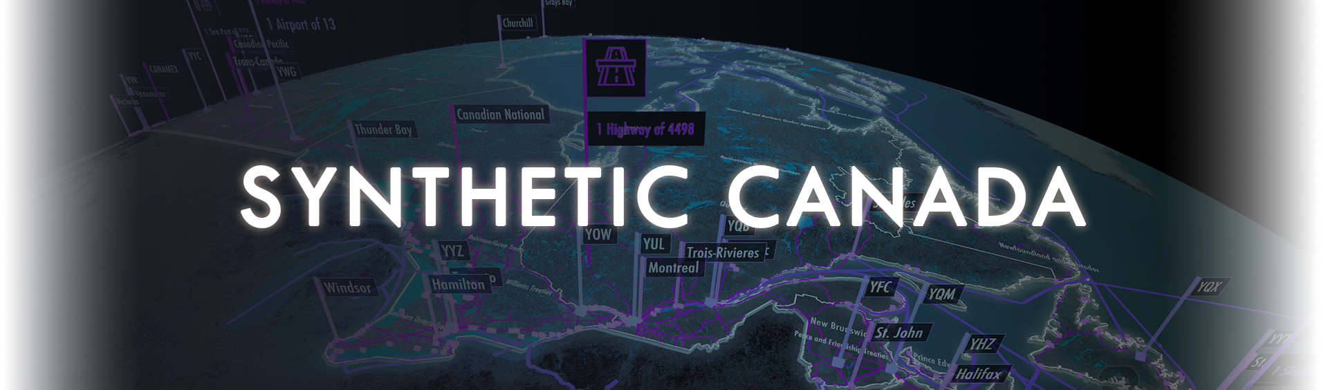 Through Synthetic Canada, users can overlay and explore the intersection of all of the elements of the built environment, including transportation, infrastructure, and natural environment, in real-time, from global to national to regional contexts through the pull of a slider. This includes 47,353,400 synthetic people across 17,330,600 residences, as well as hundreds of thousands of railway and transmission lines, substations, and airports. Synthetic Canada is demonstrable proof that RWI Labs and INFLECTOR AI can include any level of detail and show how these data points act, interact, and impact one another.